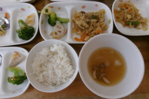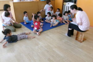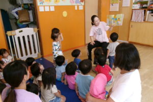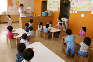 朝のお集まりで絵本を読みました。森の動物たちがお弁当を持ってピクニックへ!いっぱい遊んだ後に持ってきたお弁当を食べようと思ったらゾウさんのお弁当がない?!どんぐりの子どもたちは心配そうな顔で見ていました(^^)お弁当を見つけて、ふたを開けると太陽のサンドウィッチ、みんなの顔のおにぎりなど、美味しそうなお弁当がたくさんでした。どんぐりさんもお弁当食べようと、“おべんとばこ”の手遊びをしてみんなでお弁当を食べました(^^)