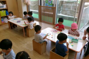 壁面の製作で、お弁当を作りました。好きな色のお弁当箱に、おにぎり、たまご、トマトなど自分の好きなおかずをのりで貼ったら出来上がりです。みんなでいただきますをして食べました(^^)美味しそうなお弁当が出来上がりました!