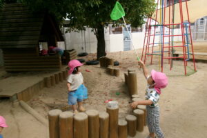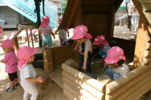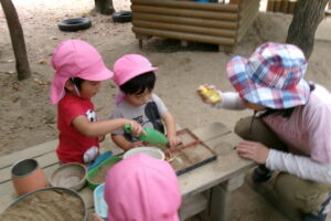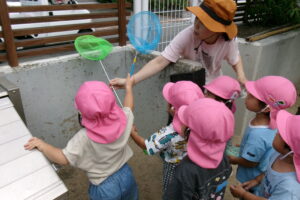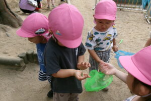 園庭で遊びました。砂場でご飯を作って友達と一緒に食べている姿にほっこり(^^)虫を探しているとバッタを見つけて、虫網で捕まえました!手に持ったり、ちょんと触ってみたりして興味津々な様子でした(^^)