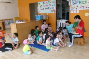 おあつまりで、「だるまさんと」のペープサートをしました。真似っこがとっても上手などんぐりさんです。そのあとは「しんごうき ピコリ」の絵本を読みました。大好きな絵本なので、長めのお話ですが、集中して見ていました。