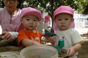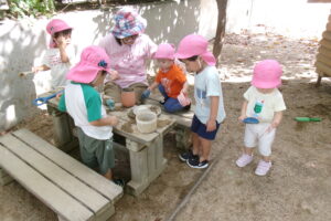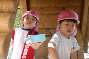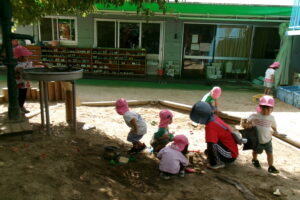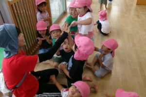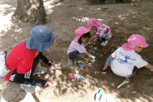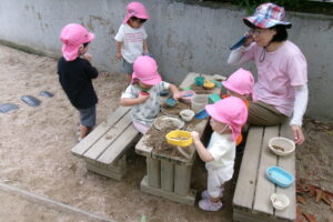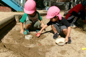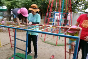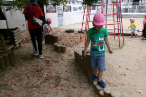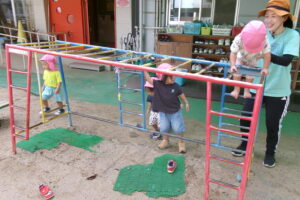 園庭に出る前に、トイレに行って皆が揃うまで、手あそびをしたりして待つのですが、最近は「焼きいもグーチーパー」が大人気です。まだじゃんけんが難しく、大人と同じだと大喜びの子もたくさんいますが、「もう一回!」と何度も繰り返し楽しんでいます。今日来ていた幼稚園のお兄さんお姉さんは、しっかり分かっているので、「勝った!」と喜んでいました。皆が揃ってから園庭に出て、たっぷりあそびました。ミニうんていに挑戦したり、おままごとを楽しみましたよ。