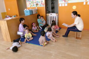 ご飯の絵本にはいろいろなご飯が出てきます。おにぎり、のり巻きなどどれも美味しそうです。どれが好き?と聞くといろいろな答えが返ってきます(^^)みんなも朝からご飯をいっぱい食べて、元気モリモリになろう!と話をしました(^^)