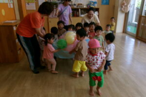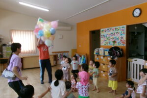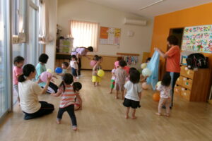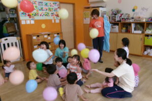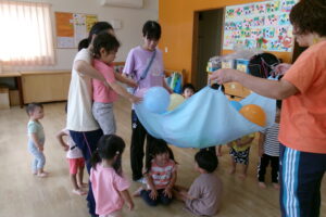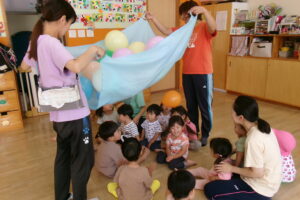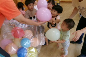 カラフルな風船が上から降ってきました!捕まえたり上に投げたりしていると、オーガンジーの布が出てきました。みんなで集めて、♪上から下から大風こい♪の歌をうたって上に飛ばすと、フワフワ〜と飛んでいく風船に大喜びの子どもたちでした(^^)次は圧縮袋に入れた風船をオーガンジーに乗せて、みんなでワッショイ!ワッショイ!と運びます。落とさないように手を離さないようにみんなで運ぶことができました!