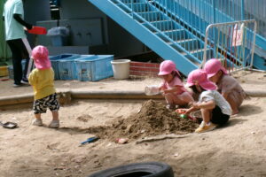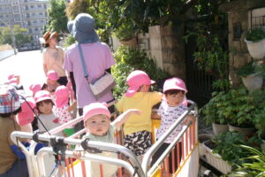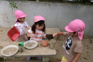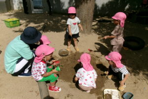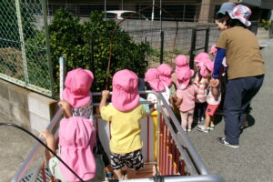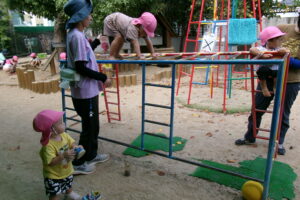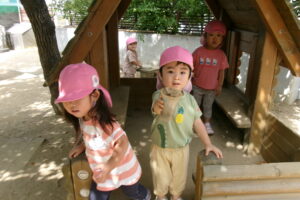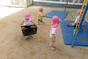 近くの柿の木を見に散歩へ出かけました。大きな柿の木にはたくさんの柿がついていますが、まだ黄緑色をしていました。次に来る時にはオレンジ色になっているかな?じゃあ、美味しくなあれの魔法をかけよう!とみんなで魔法をかけて、また見に来ようねと話をして柿の木を後にしました。帰る途中に、みかんの木を見つけました。美味しそうな色だったので、みんなでうそっこで食べました。一口食べておいしい!と言う子どもたち(^^)秋の果物を2つも見つけて大満足です(^^)帰ってから園庭で遊びました。