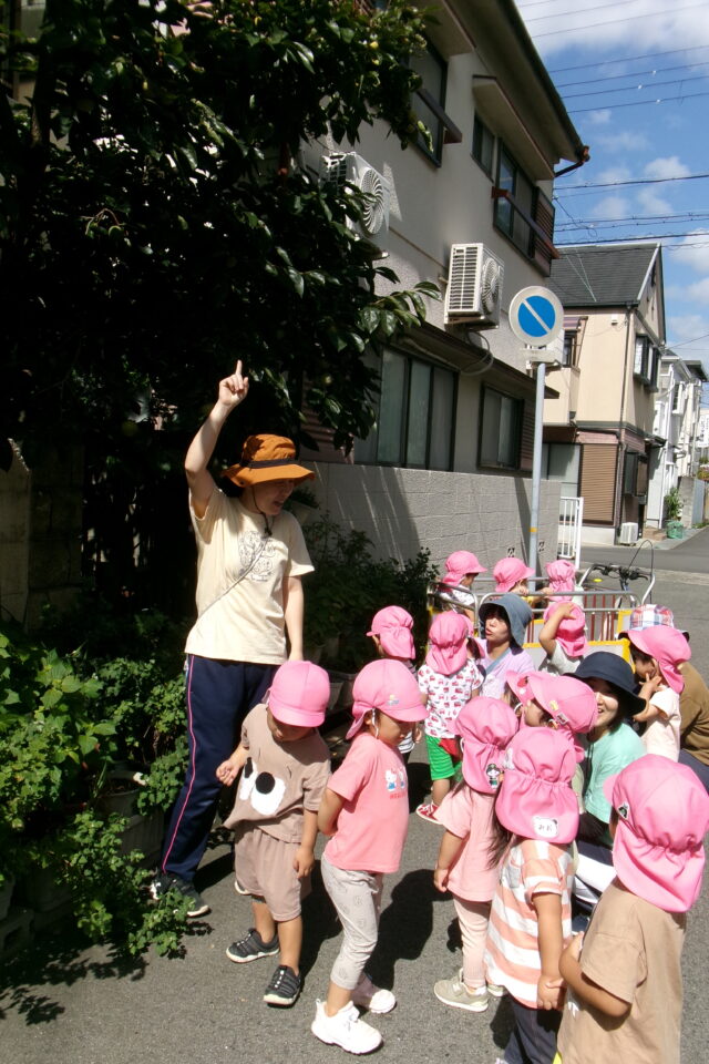 近くの柿の木を見に散歩へ出かけました。大きな柿の木にはたくさんの柿がついていますが、まだ黄緑色をしていました。次に来る時にはオレンジ色になっているかな?じゃあ、美味しくなあれの魔法をかけよう!とみんなで魔法をかけて、また見に来ようねと話をして柿の木を後にしました。帰る途中に、みかんの木を見つけました。美味しそうな色だったので、みんなでうそっこで食べました。一口食べておいしい!と言う子どもたち(^^)秋の果物を2つも見つけて大満足です(^^)帰ってから園庭で遊びました。