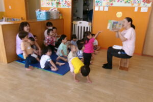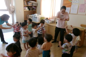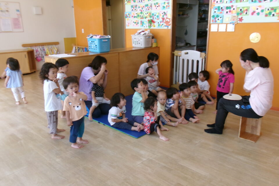 みんなでにらめっこをすると、一生懸命に面白い顔をする子どもたち(^^)保育士に負けじと面白い顔をたくさん見せてくれて、部屋が笑い声であふれました(^^)