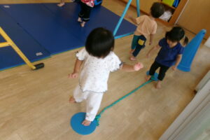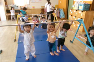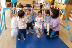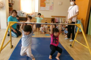 名前を呼ばれたら子どもから鉄棒にぶらぶらぶらさがって、ロープの橋を渡って遊びました。ぶらさがって、足を上げてブラブラします。頭と体をしっかり支えることで転けた時にとっさに手が前に出るようになります。何度も繰り返ししていると、足が上がらなかった子も少し上げられるようになったり、ぶら下がるのを楽しんでいました(^^)