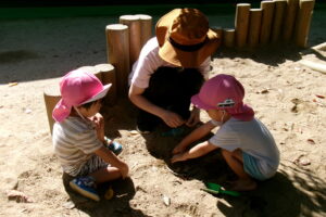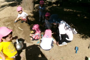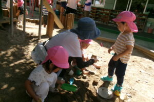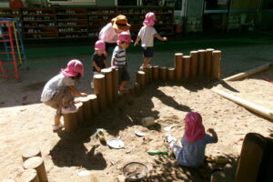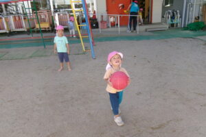 友だちと始めはボールで遊んだいましたが、遊びが進むにつれ、ボールやおもちゃがなくても遊びが発展して大きな声で笑ったりとっても楽しそうなどんぐりさん(^^)砂場でもデザート屋さん、のり巻き屋さんなど、お店やさんごっこが盛んに行われていました(^^)