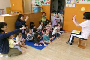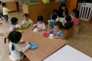 焼き芋グーチーパーの歌でジャンケン遊びをしました。「ジャンケン…ポーン!」のタイミングで一生懸命手を伸ばして「グー(だよ)!」と教えてくれたりお友だちと何を出したか見比べてみたりしていました。ジャンケンに勝っても負けても楽しい手遊びです。