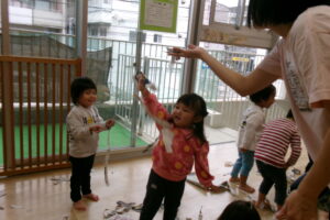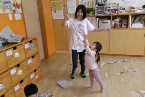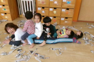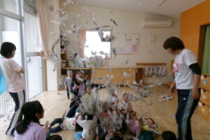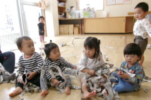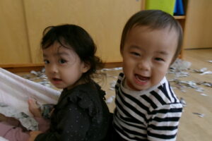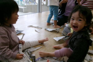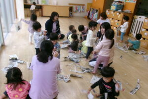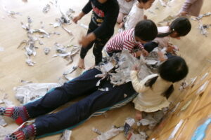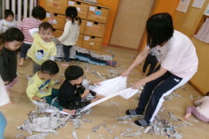 新聞をビリビリちぎったり、ギュッギュッと丸めてアイスやキャンディを作っていました。小さくちぎれた新聞紙をパラパラ降らせると大喜びです。保育士が寝転んだらお布団をかけるように新聞紙を乗せていたり、お友だち同士でもかけ合いっこしていましたよ。バスタオルの車に乗って新聞紙の道を通ると「行ってきまーす!」と言うようにニコニコして手を振っていました。「到着でーす!」と言っても「もう一回」と何回もバスタオル車に乗って楽しんでいました。最後はオーガンジーに集めて大風こいをして新聞紙を降らせるとまたまた大喜びのどんぐりさんたちです!まだかまだかと降ってくるのを楽しみにしていました。