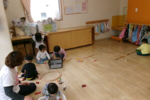 電車コーナーとケーキのろうそく立て遊びコーナーでほっこり過ごしました。
