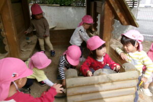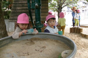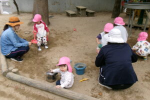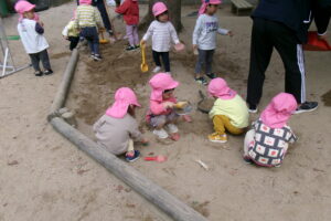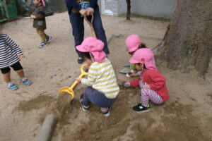 園庭で遊びました。大人がシャベルでお砂場の土をほぐしていると