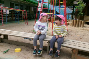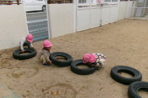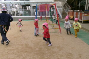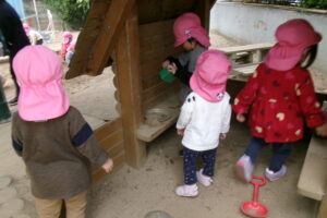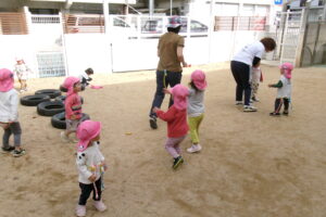 、楽しそうと思ったようです。子ども用のシャベルを渡すとずっとお隣で上手に真似して手伝ってくれたお友だちもいました。お料理したり、丸太の上を歩いたり、好きな遊びを楽しみました。しっぽ取りする人〜とみんなに声を掛けるとたくさんやりたいお友だちが集まりました。何度もなんども「モウイッカイ!」と遊びました。シッポを取られても泣くお友だちは誰もいなくて感心しました。