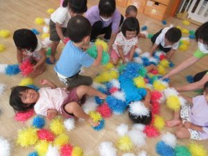 ポンポンを使ってカゴの中に誰がたくさん入れれるかの競争をしたり、大きな池を作って飛び跳ねて渡ってみたり、小さな池では片足で”おっとっと”となりながら入ってみたりと楽しみました。