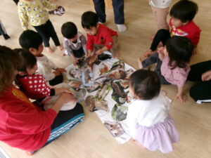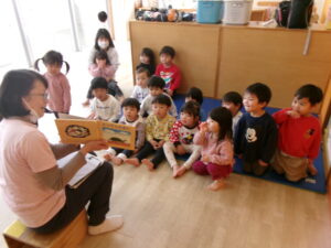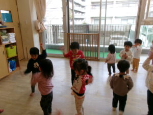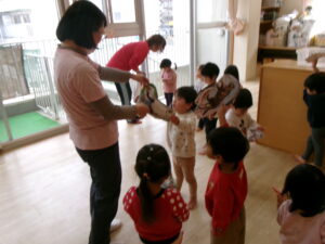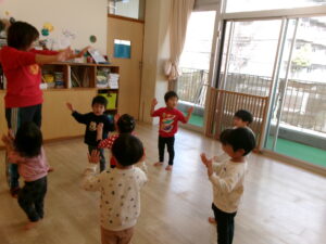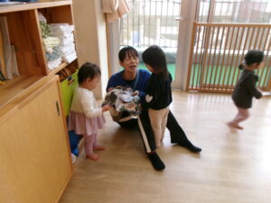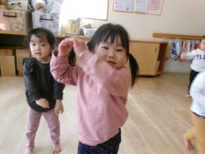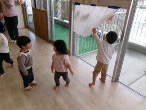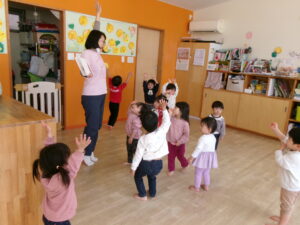 絵本『だるまさんが』の真似をして遊んでみたり、指忍者の手遊びをしたりしました。久しぶりでも子どもたちはよく覚えていました。お気に入りの遊びなのでさすがです。