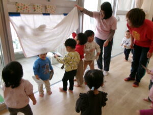 布の後ろにいたり、カゴの中にいたりしましたが全部見つけ出した子どもたちです。