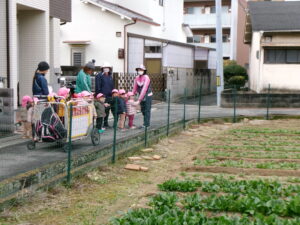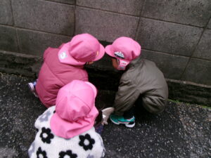 〈ぶらぶら散歩〉くもったり晴れたり、ポツポツ雨が降ったりのお天気でした。近くをぶらぶら散歩にでかけようとのぞき穴へいきました。途中、ボケの花が咲いていて、ぷっくり膨らんだつぼみも見つけました。春、みーつけた!と大人の真似をして言っていた子どもたちです。