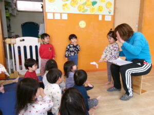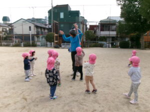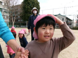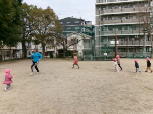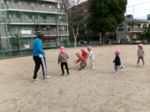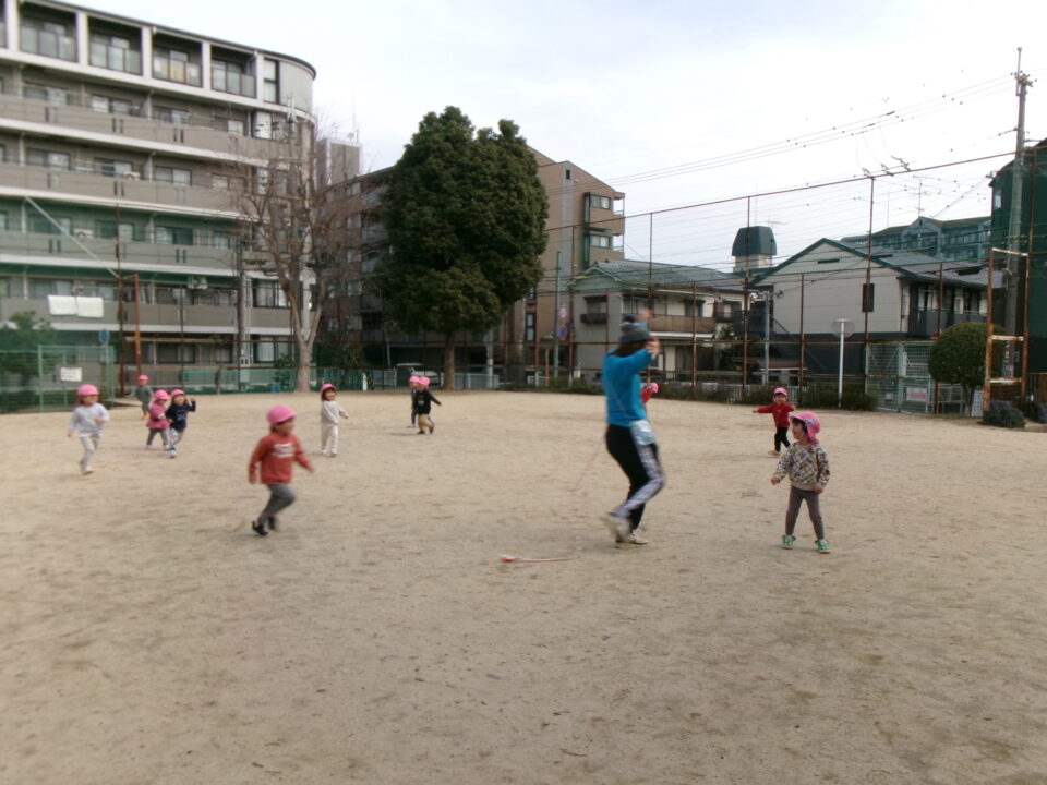 今日は2歳児のお友だちも多い日だったので、追いかけっこ遊びをしたいな!と思い小さな子達も分かりやすいように大人に長ーいしっぽを付けてしっぽ取り!お集まりで話すと「やりたい!やりたい!」と元気いっぱい!