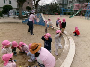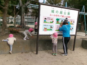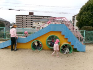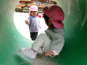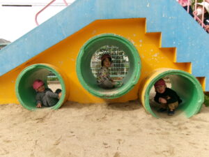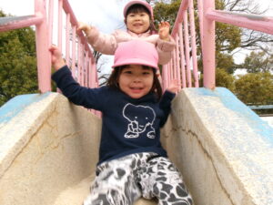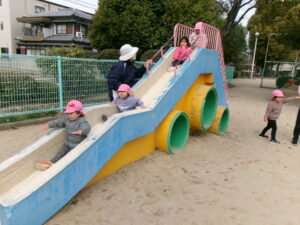 公園で遊ぼう!と移動すると、滑り台に真っ直ぐ!みんなで高い所からまずはご挨拶!「おーーーーい!!」と嬉しそうな子ども達^_^