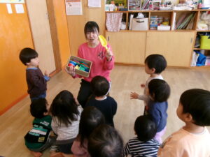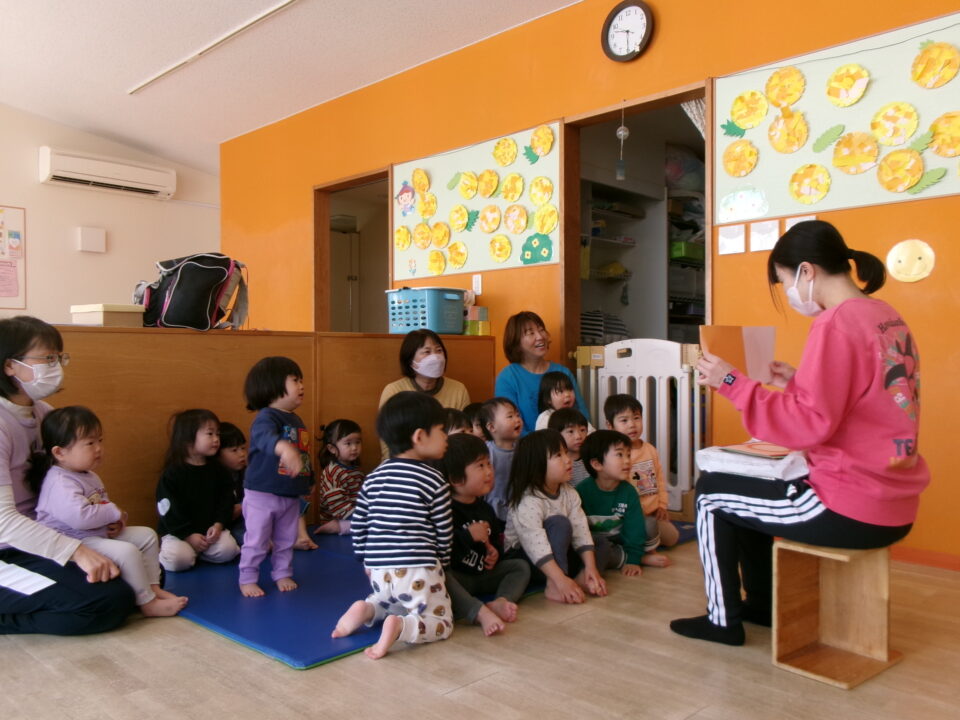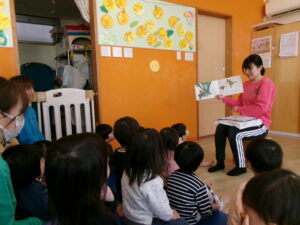 丸い形の紙を横にスライドさせると色や形が変わる不思議なマジックシアターをしました。オレンジ色の丸からみかんになり、赤い丸からりんごになるとパクッと嘘っこで食べていました。緑色の丸は亀の甲羅に、茶色の丸はカタツムリの殻になるなど、丸い形でいろんなものに変わっていく様子を楽しんでいました。絵本はこれを読んでほしいという思いに応えて「おおきなかぶ」を読みました。