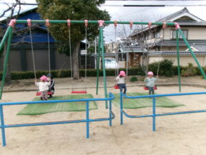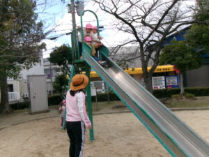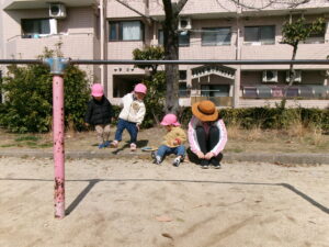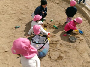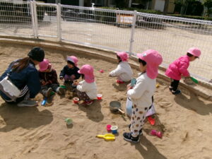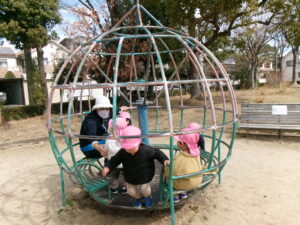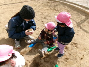 公園に遊びに行きました。風がピューと吹く時もありましたがどんぐりさんは元気いっぱいで滑り台やブランコの遊具をしたり、どんぐりを探したりしました。砂場では寒くてもアイス屋さんが大人気でたくさん作っていました。砂場用の新しいおもちゃを持って行くと真っ先に手に取りながらも、お友だちと順番だよ、貸してって言ってねのお約束も守って順番に使っていましたよ。