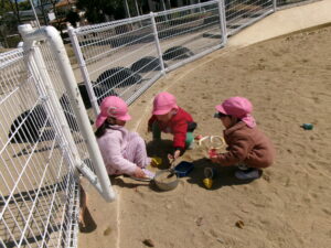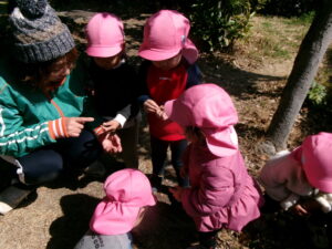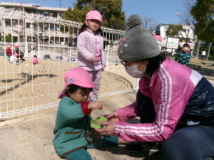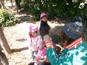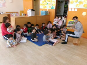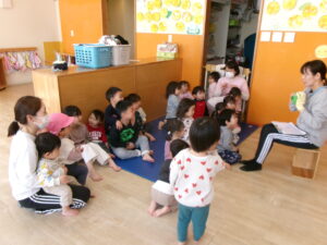 おあつまりで『キャベツの中から』の歌に合わせて、手袋シアターをしました。歌を知っている子は一緒に歌ってくれました。「暖かくなってきたから、公園でちょうちょ見れるかな?」と楽しみにしています。そのあとは『しんかんくん ようちえんにいく』の絵本を読みました。「どんぐりさんももうすぐ幼稚園に行くお友だちがいるね」と言うと、ぼくも!わたしも!と嬉しそうでした。
