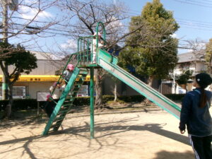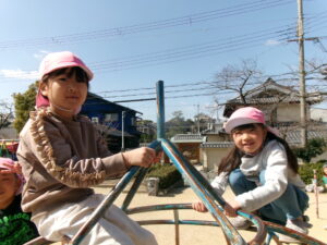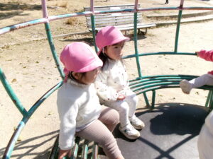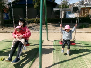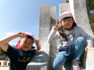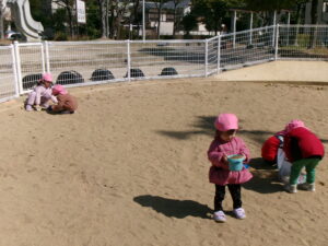 公園におさんぽに行きました。お兄さんお姉さんと手を繋いで歩くと、あっという間に着きました!公園では、遊具であそんだり、どんぐりを探したり、砂あそびを楽しみました。