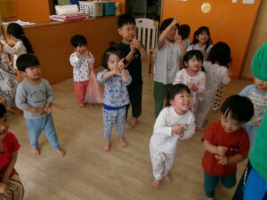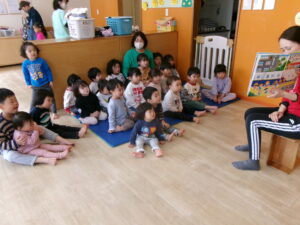 今日はしんかんくん、ようちえんにいくという絵本を読みました。もうすぐ幼稚園に入園するどんぐりのお友だちもいるので、幼稚園は何をするのかな?どんな楽しいことが待っているのかな?と期待を膨らませてもらおう!と思い、今幼稚園に通っているお友だちにも、幼稚園でどんな遊びをしているのか聞いてみました。それぞれ好きな遊びだったり、今はまっている遊びを教えてくれました。新しい場所は初めは少しの不安があるかもしれませんが、その先にはきっと!楽しいことが待っています。それが少しでもみんなに届くといいな(^^)
