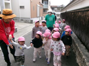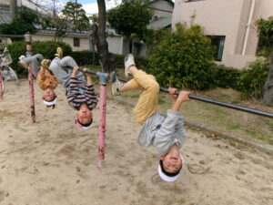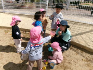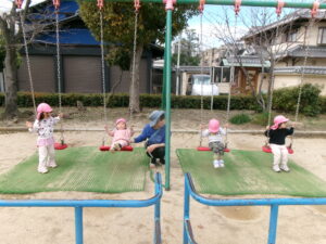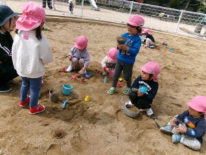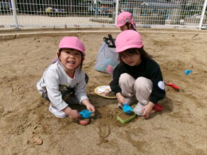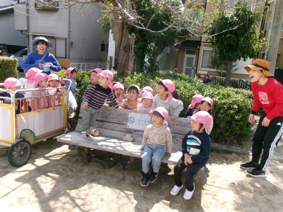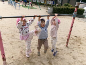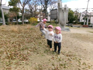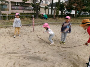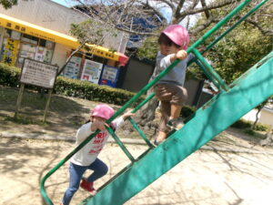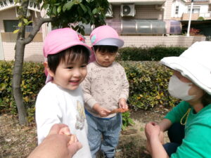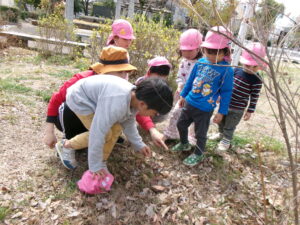 春休みなので、公園にはたくさんのお友だちがいました。その中でゆずり合いながら好きな遊びを楽しみました。年長組のお友だちがしている長縄を見て、小さいお友だちも真似して飛んだり、暖かくなってきたので、チョウチョやダンゴムシも捕まえたりと、春を感じつつたくさん遊びました!