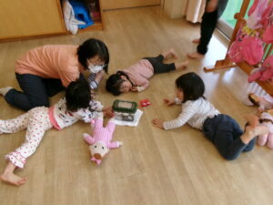 青はススメ。黄色はキョロキョロ。赤は止まれ!ピンクは…ナイナイ。保育士の声をよ〜く聞いて楽しんでいました。
