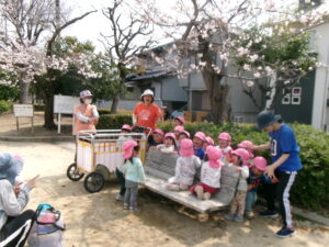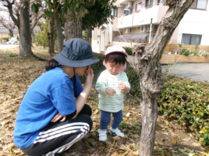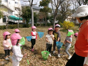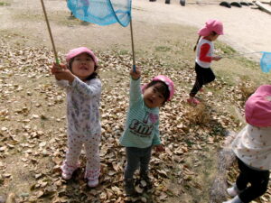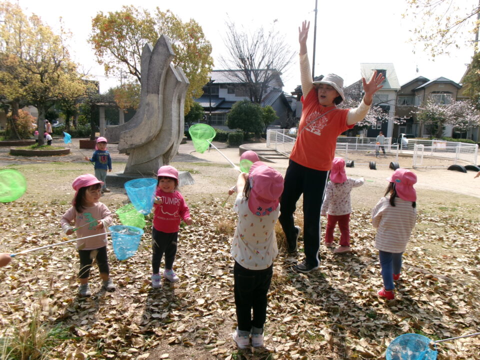 公園では、子どもたちが、虫あみ片手に現れた蝶々🦋を追いかけて右へ左へと走りまわっていましたよ♪蝶々が現れない時は、木からヒラヒラ落ちて来る枯葉を虫あみでキャッチしたり、保育士が集めた枯葉をカゴいっぱいに集めて喜んでいました。