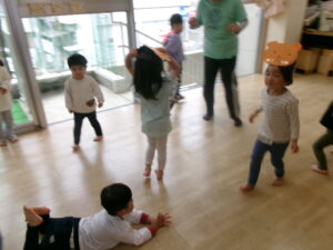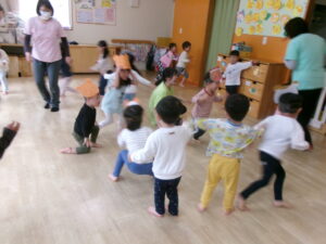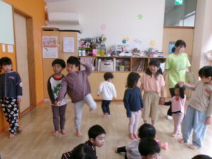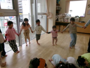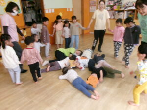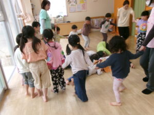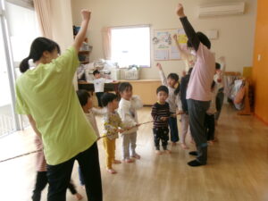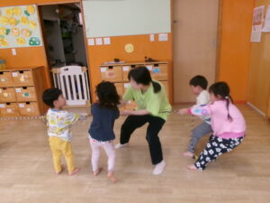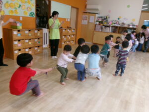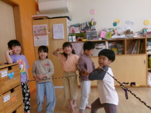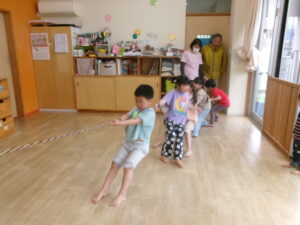 どんぐりでの遊びを満喫してほしいと思い、何がしたいか聞くと綱引き大会がしたいとのことでしたので開催しました!まずはウォーミングアップで体を動かそうとむっくりくまさんをしました。くまさん役になりたいお友だちが寝てるふりをしてそれを起こしに来たどんぐりさんたちを追いかけます。追いかけるのも、追いかけられるのも楽しいので何回かくまさん役を変えて楽しみました。そしていよいよ綱引き大会!まずは年長さん対どんぐりさんたち。どちらも気合い充分で挑み、年長さんの勝ち!2回戦目はどんぐりチームに保育士が加わりいざ、勝負!勝敗はどんぐりチームの勝ちでした!3回戦目はどんぐりさんを2チームに分けて対決!4回戦目は女の子対男の子!そして5回戦目は年長さん対保育士2人!これはどちらも負けられないと双方気合いを入れて戦いました。顔が真っ赤になるほどそれぞれ頑張り、結果は…年長さんチームの勝ち‼︎年長さんたちは大喜びでした!力を合わせて勝てたと喜ぶ姿が本当に素敵で、こんなに力強い年長さんたちならどこに行っても大丈夫だと思います!「疲れた〜」「のど渇いた〜」とみんなでほっこりお茶を飲みました。