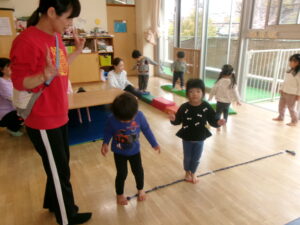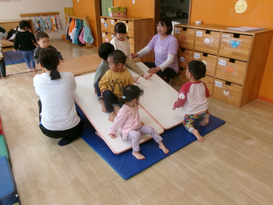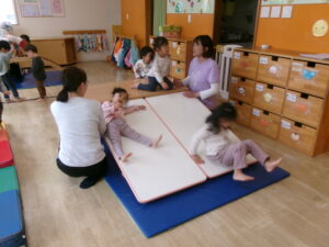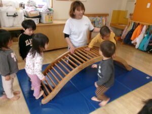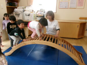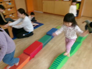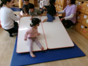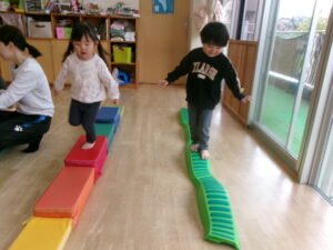 雨が降ったり止んだりなので、お部屋でサーキットあそびをしました。凸凹道や、太鼓橋、すべり台のコースです。今日は太鼓橋が大人気でしたよ!