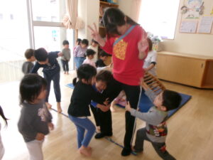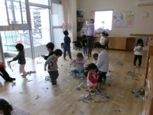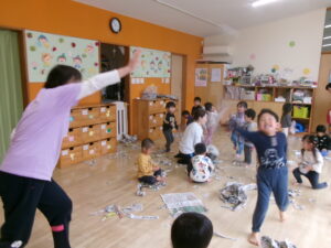 サーキットのあとは新聞紙であそびました。丸めて、「キャベツ!」と言ったり、集めてお芋掘りごっこをしたり、ボールとバットにして野球ごっこをしたりと、新聞紙ひとつで色んなものに見立ててあそぶ事が出来ます!子どもたちの想像力にビックリでした(^O^)/