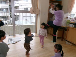 今日から新年度がスタートしました!おあつまりで、「ひとつお兄さんお姉さんになったね、おめでとう!」とお話をすると、幼稚園の新年長さん、新年中さんは誇らしげな顔をしていましたよ!もうすぐ幼稚園に行く子たちも、よく分かっていて、何だか表情が凛々しく見えました。どんぐりさんの子どもたちも、これから新しいお友だちがたくさんやってくるので、よろしくねと言うと、ニッコリでしたよ!今日からのお友だちも、色んなものに興味津々な様子でした。