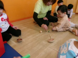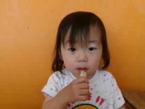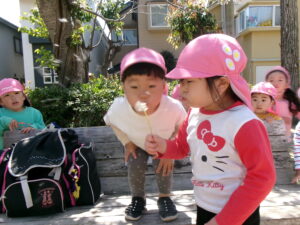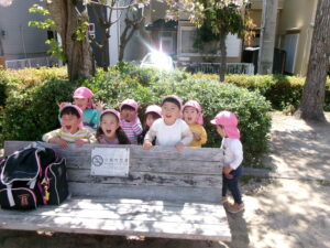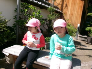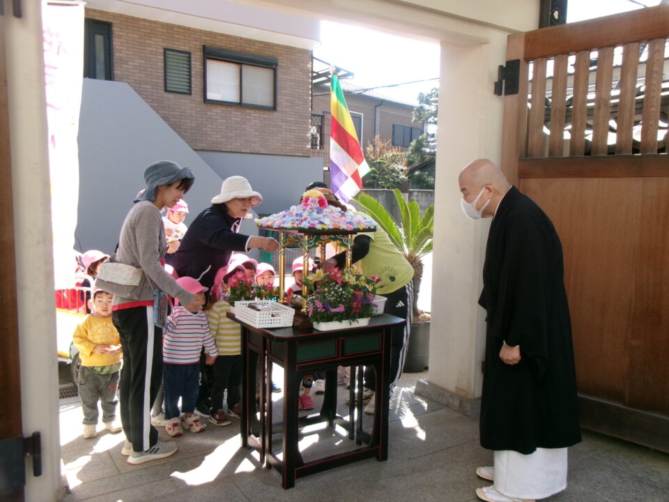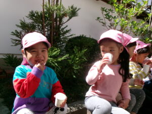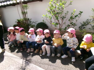 そのあと、「公園に行こう!」と出発したら、守部神社で、『花まつり』をしていたので、見せていただく事にしました。住職さんのお話では、花まつりは、お釈迦様の誕生を祝う行事として、誕生仏に甘茶をそそぎかけたり、甘茶をいただいて無病息災などを祈ります。甘茶はアマチャの葉を煎じた甘いお茶で、誕生時に甘露の雨が降ったという伝承に由来するそうです。今日はなんと!保育士や子どもたちにも甘茶を用意してくださったので、みんなで座っていただきました!初めての味にビックリする子もいましたが、「おいしい!」とみんな飲みましたよ!