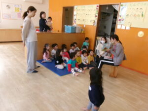 おあつまりで、「だるまさんが」のペープサートをしたあと、お名前を呼んで、「さんぽっぽ」の絵本を読みました。