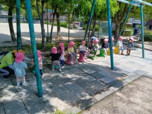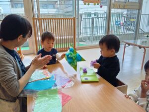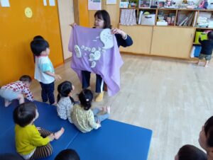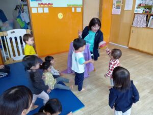 最後には紙風船まで出てきてみんなで優しく触ってみました。すぐに破ってしまうかな〜と思いましたが、みんなとっても優しくポーンとお友だちへパスしてくれましたよ^_^