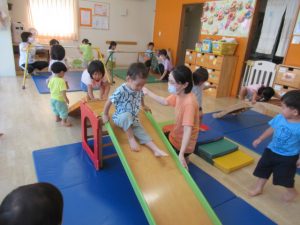 最近気温も高くて、公園にも遊びに行けていないお友だちも多いと思うので、今日はお部屋をどんぐり公園に変身して遊ばない!?と聞くと「えーーー!!!やったーーー!!!」と飛び跳ねて喜ぶ子どもたち。よっしゃ!遊ぼう!と準備の間は窓の所に並んで待っててくれました。最初は名前を呼ばれた順にやってもらい、全員が終わってから好きな所でたくさん遊びました!!太鼓橋、階段マット、高さの違う鉄棒(選べるものがあると遊び方も変えられたり挑戦しやすくなったりするのですよ!)、滑り台、盛りだくさん!身体をたくさん動かして遊びました。