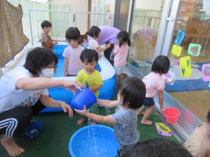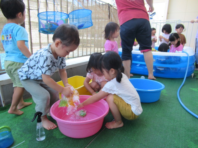 朝のお集まりで作った、花紙の混ざった水袋もタライに入れて感触遊びや、水鉄砲、スプレー、などなどで遊びました。子どもたちも暑かったのか、シャワーの水を求めて「コレコレ(出して出して)」と指差しするので、シャワーでトンネル。自ら濡れに来たりして面白かったです。ビショビショになって喜ぶ友だちの顔を見て喜ぶ子どもたちがとっても楽しそうでしたよ。^_^
