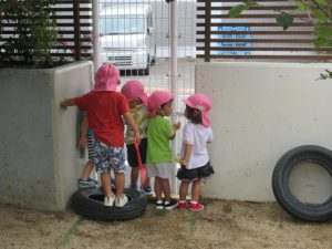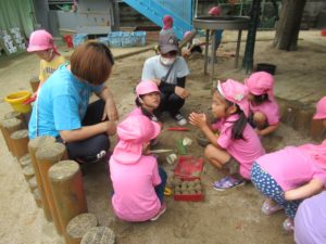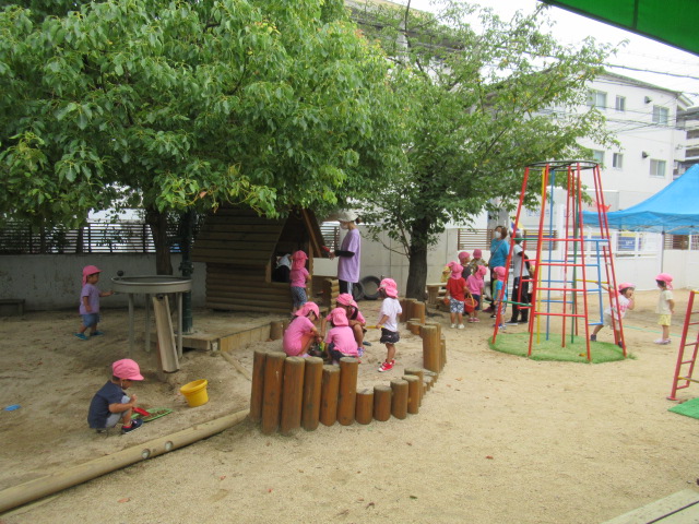 久しぶりに公園で遊ぼう!と外に出たら、、、。「雨降ってるでー!!」と先に出た子どもたちが教えてくれました。「えーーーー!!!」「遊びたいやんねー、これぐらいの雨なら園庭で遊ぼう!」と遊び出すと、木の下。みんなよく考えてますね。大きな木なので、充分遊ぶ事が出来ました。山や、カップケーキ、団子屋さんなどお店屋さんがあちこちにいっぱい!蝉も手の届く所で鳴いていて、観察したり捕まえてみたりする事も出来て、喜んでいましたよ!