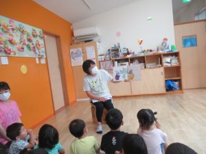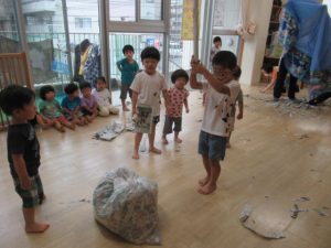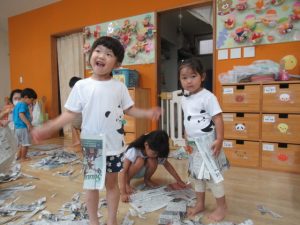 たくさんの新聞紙を使って遊びました。トイレットペーパーの芯やガムテープを使って新聞紙を丸めたり破ったりしながら好きな物を工夫して作っている子や新聞紙に載っている写真を上手にちぎって集めている子もいました。新聞紙プールを作り、中に入って楽しそうに泳いでいる⁈子もいましたよ🎵みんながちぎってくれた新聞紙を袋に詰めてスイカ🍉を作りみんなでスイカ割りをして遊びました。夢中になって遊んだら手も足も新聞紙で真っ黒け!汗もびっしょりかいたので暖かいシャワーを浴びてスッキリしました。