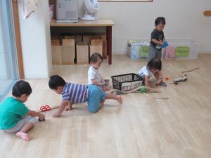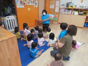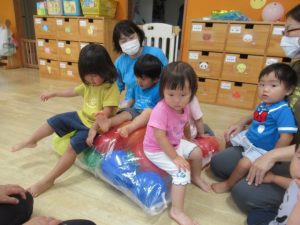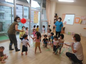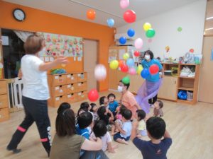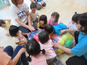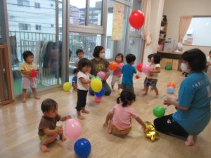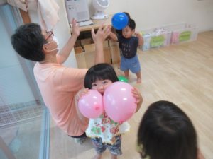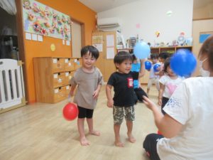 “シュポシュポ”と風船に空気を入れて準備していると子どもたちが何だ?何だ?「何してるの?」と集まってきました。「後でみんなで風船遊びしようね〜」とお話しし、お集まりでみんなの知っている形の風船やキラキラした金色の風船、ブタさんの形でフワフワした手触りの風船など、色々な種類の風船を膨らませて見てもらいました。子どもたちは興味深々。「触ってみたい!」と言うので1人ずつお名前を呼んでキャッチボールしながら朝のご挨拶をしました。みんな嬉しそうにキャッチして返球もとても上手でしたよ。