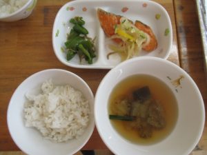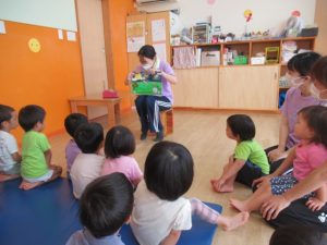 朝晩が涼しくなり、窓を開けて過ごす時間が増えたと思います。そうすると、外から虫たちの素敵な音楽会が聞こえてきませんか?😊どんぐりのお友達に、夜になると虫たちが鳴いているんだよと話をしました。どんな虫たちが鳴いているのかな?名前と鳴き声をペープサートで紹介して、最後に♪むしのこえ♪をみんなで歌いました。夜、お家で虫たちの声が聞こえると思うから、テレビを消して静かに耳をすませてみてね!とお話をしました😌