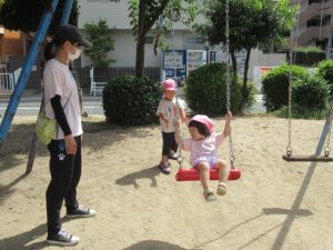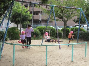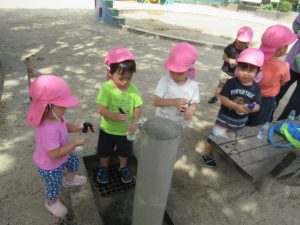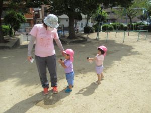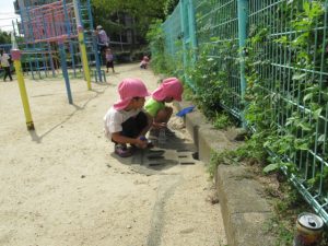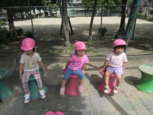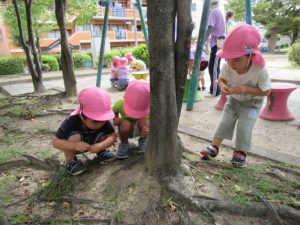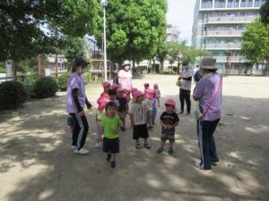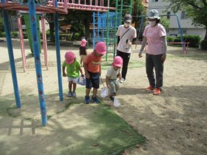 城の越公園へお散歩に行ってきました。公園に着いたらまずは先生の話を聞きます。公園で遊ぶときの約束事のお話です。みんな、勝手に遊具の方へは行かずに待って話を聞いてくれました😊霧吹きスプレーと虫網を持っていきました。良くどんぐりに来てくれているお友達は勝手を知っているので、スプレーをもらうと自分で蛇口の水をボトルに入れます。お友達と順番交代で入れていました😉草むらの方にはとんぼや蝶々など虫がかくれんぼしていないかなぁと虫編みを持った子ども達が集まって、みんなで一生懸命虫を探していましたよ!トノサマバッタを見つけたお友達!虫編みを持って追いかけるけど中々捕まえられなくてしょんぼり顔。。。と思ったら次の虫を探していて切り替えの早さにビックリしました😊一生懸命虫探しをしている顔はすごく生き生きしていて輝いていました✨お部屋に戻ってからシャワーで汗を流しました!