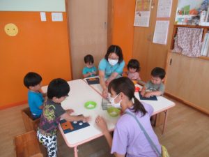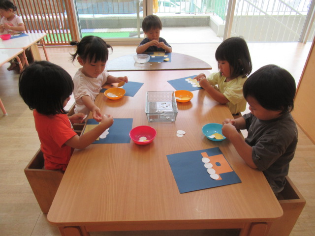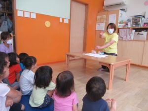 毎朝、朝のお集まりでは手遊びやペープサート、絵本などを読んでみんなの名前を呼んでいます^_^ 今日はカプセルをお湯につけ、お湯の中で溶けてスポンジの乗り物に変身するところを見ました。溶けている間も「長いな〜」と言いながらも待って見てくれました!絵本は「お月見おばけ」を読みました。
