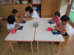 まだお団子をお供えしていない状態の用紙を配り、そこに自由にお団子をお供えして、最後に月も貼ってもらいました。月に顔を描きたい人は描いて出来上がり!両面テープを剥がすのもなかなか難しく指先も使う作業です。指先をカリカリ動かすと剥がれるよ!と説明もよく聞いていてたくさん貼っていました。また、壁面に飾りますので見てやってくださいね!