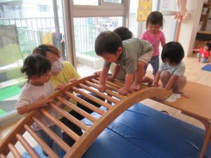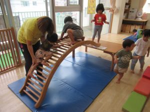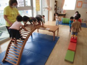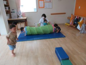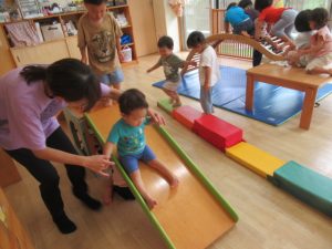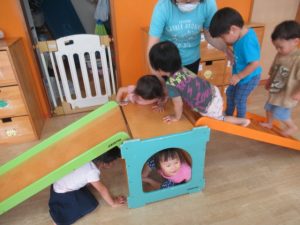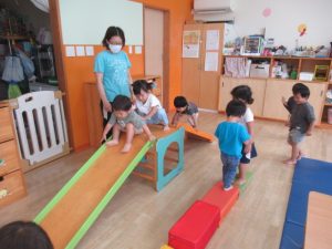 滑り台、太鼓橋、凸凹マット橋、トンネルを組み立て、好きなところでいっぱいあそぼう!と、それぞれのコーナーの入り口を知らせました。ぶつかり合わないように遊べるかな?遊びに夢中になるとついつい近道をしてしまうお友だちもいるので、その度にこっちだよー!と声を掛けます。それでも、こっちからが良い!というお友だちもいますが、そんな時、私たちよりお友だちから教わったりする場面もあり、ケンカになったり、反省したり、そんな場面を大切に見守っています^_^ 集団生活の約束・ルールを厄介だと感じる事もあると思いますが大切な小さな社会ですもんね。何度も繰り返し伝えていきたいと思っています^_^