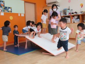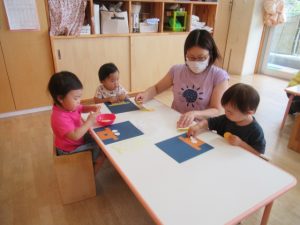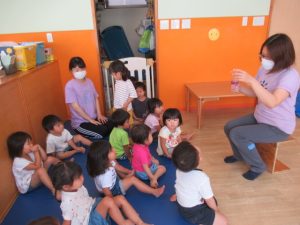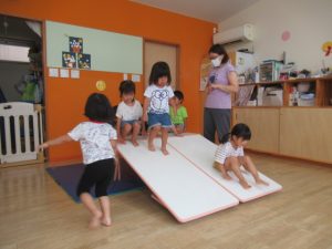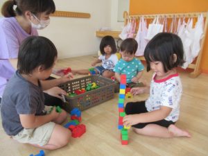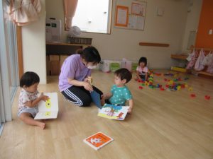積木、滑り台、絵本のコーナーを用意してあそびました。遊びきったら次のところへ遊びにいく子、一つの場所でずーっと遊ぶ子、それぞれが好きな遊びを見つけて遊びました。