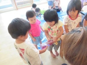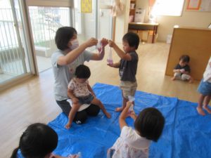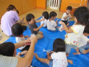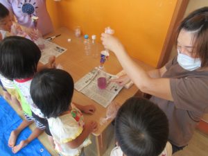 朝顔の咲き終わった花の部分を使って色水を作りました。袋に水と花が入ったものを揉んでもらって、だんだんと色が出てくる様子を見ました。少しずつ色が出てきて「見てみてー」と教えてくれたお友だちもいましたよ。ペットボトルに入れると紫色のぶどうジュースのようになりました。簡単に色が出るので楽しい遊びになりました。